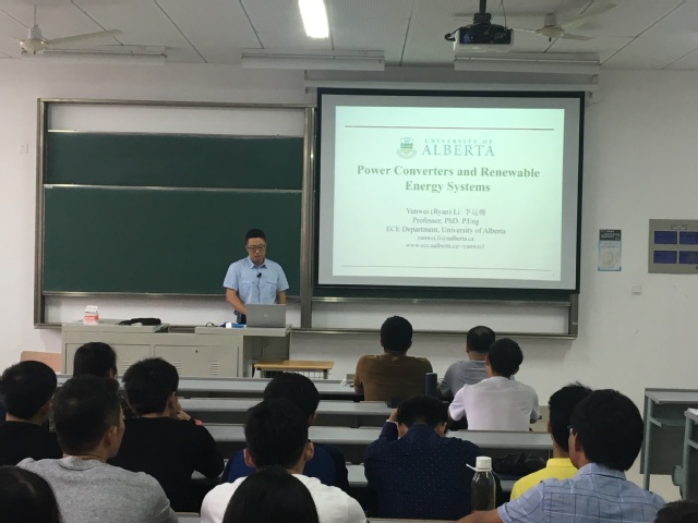 李教授在介绍加拿大阿尔伯塔大学的基本情况后,以《Power Converters and Their Applications》为主题,讲解了电力电子技术在新能源电力系统中的应用。李教授从基础性理论出发阐述了电力电子变流器控制技术在电动机驱动、高压直流输电中的应用。李教授浅显易懂的讲课风格,充分调动了学生的听课积极性。