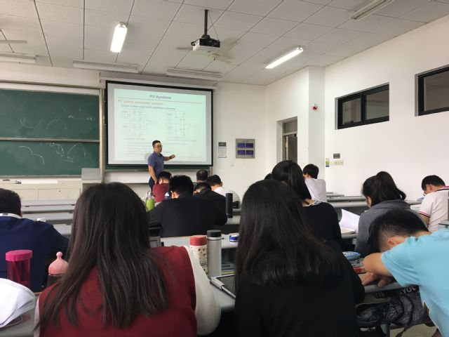 李教授以《PV Systems》为题,首先介绍了光伏发电系统的原理、太阳能板的等效电路;然后介绍了自己在基于软开关的DC/DC变流器、大功率光伏发电并网系统拓扑等方面的研究。其中微电网中变流器并网运行和孤岛切换技术(智能电网技术领域中两种新方法)的讲解开阔了同学们的眼界。