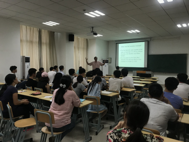 Ashfaq教授是工程技术领域上的专家,以“晶体管是何时发明的?”这个问题引出他今天讲座的主题。随后又以“一个理想的功率开关是什么?”引发同学们的积极思考,之后从导通电阻、电容等方面详细介绍了eGaN的优点。