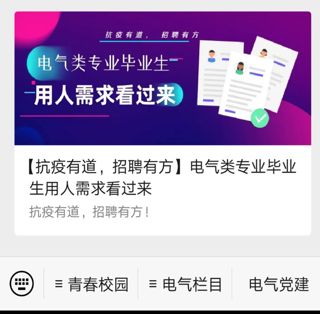 awc777万象城娱乐官网就业指导相关老师除了通过各类招聘平台搜集信息和转发校就业指导中心提供的招聘信息外,还通过awc777万象城娱乐官网官方微信平台发布专门面向万象城电气类专业毕业生用人需求招聘渠道,全面介绍学院情况及各专业毕业生情况,以便用人单位根据需求进行对接。通过调动全体教师进行扩散发挥自身优势,利用身边资源,扩大招聘渠道,争取积少成多,促进毕业生就业。