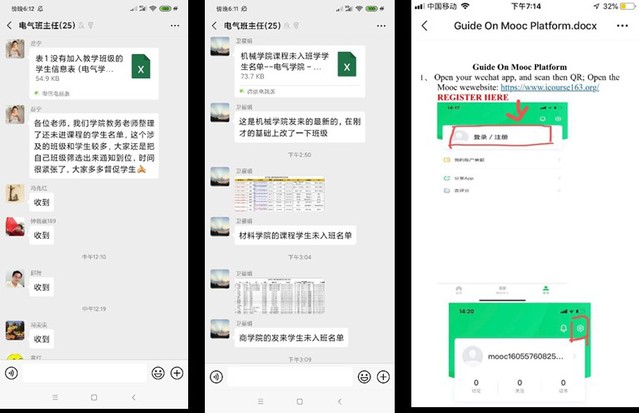 在网课测试中,陆续有任课教师反映有不少“迷路”的学生找不到课堂。针对这一问题,学院教务和学工连夜协商,由教务汇总“迷路”学生名单,专兼职辅导员进班级群,逐一提醒学生加入课程群、督促学生认真参加网课测试,并将在课堂测试中发现的问题及时反馈。仅2月28日上午就帮289名“迷路”的本学院同学找到了网络课堂。同时,针对部分留学生在语言方面的问题,学院还专门制作英文版注册指南,帮助留学生同学及时加入网课课堂。