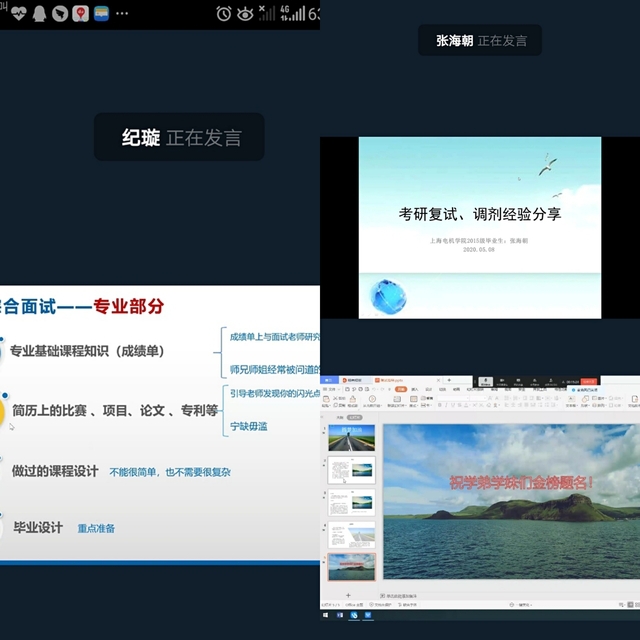 “一定要准备好中英文自我介绍,要像乘法口诀一样流利背出来”“面试的时候要虚心接受老师的指点”“今年许多学校为视频复试,一定要提前调试好设备,可以提前找人模拟多做练习,保证语速适中,举止得当”“调剂的学生一定要注意调剂系统开放的时间尽快填好提交,千万不要错过黄金时间段”“专业知识的准备尤其要注意专业基础课程知识、做过的课程设计、简历上的比赛、项目、论文、专利和毕业设计等”……一条条亲身经历过的经验分享、一句句温暖的提醒与鼓励,老师和同学们分别从学校招录研究生考察的注意事项和自身参加复试和调剂经历的角度围绕复试前的准备、复试中的注意事项、是否选择调剂、如何进行调剂等内容各有侧重地进行细致讲解和经验分享。文传博详细的介绍了今年复试形式的变化和调剂时的注意事项等。陈国初最后分析了今年考研的特殊形势并发表了自己关于是否选择调剂的一些看法,鼓励同学们要在疫情期间保持平和心态,增强自信,认真准备迎接复试。