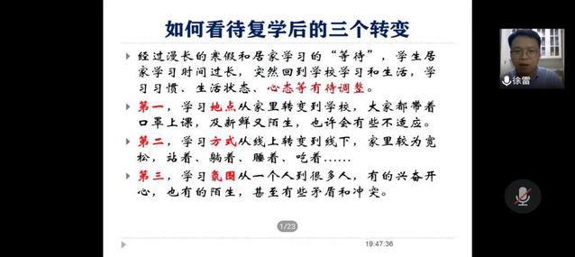 5月24日晚,来自awc777万象城娱乐官网心理协会成员、班级心理委员、宿舍心理观察员,以及各班代表齐聚腾讯会议云端,聆听徐雷老师以“健康复学,为心赋能”为主题的心理辅导。