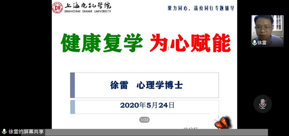 本次讲座是2020年“525”大学生心理健康教育月活动的内容之一,着重针对疫情防控期间学生心理以及复课复学过程中学生群体的主要心理疏导需求,疫情下同学们生活中出现的各种问题,让同学们能尽快的适应返校复学的学习节奏,为心赋能。疫情之下,长期久居家长的不少同学都十分渴望返校,但因疫情的持续影响,目前大部分学生,还是继续在家开展学习。虽然师生相聚虚拟“云端”进行了网上授课与学习,但对于有些自制力弱的同学来说,网上学习是很难自觉按时完成的。尤其是临近期末,学业考试的压力更加剧了同学们的焦虑心理,如何正确疏导这种心理压力?徐老师通过几个生动的例子进行专业的解释说明,还告诉我们,焦虑本身就是对不确定性有关,在疫情中,不是让同学们不焦虑,而是提高抗焦虑的能力,提高同学们对不确定性的能力,来缓解焦虑情绪。