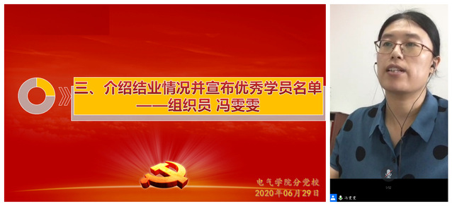 组织员冯雯雯老师党校结业情况和宣读优秀学员名单,本期党校按照在线考试成绩占50%,思想汇报占15%,学习小结15%、小组讨论占10%,网课学习进度占10%的比例计算。本期党校共有154名学员顺利结业,结业率98.7%,其中按10%的比例评选出电1912班曹荣斌等15名同学为优秀学员。