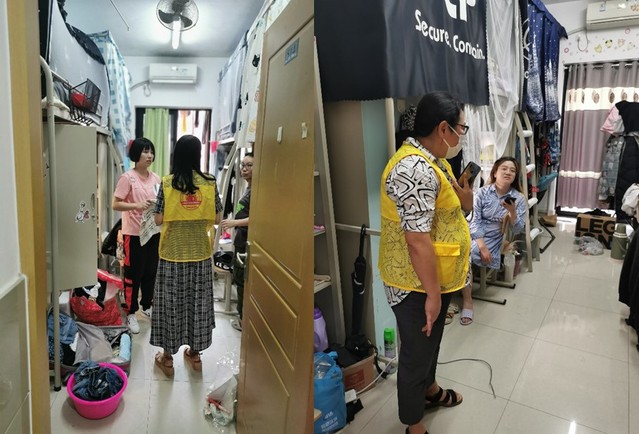 随后志愿者队伍来到生活园区,当时宿舍楼下面还晾晒着学生的棉被、床单,刹那间天空下起了雨,教师志愿者们火速将在晾晒的棉被等收到宿舍阿姨处。在学生寝室,教师志愿者们与返校学生亲切交流,亲切询问同学疫情期间的学习情况、返校方式、旅途情况、寝室衣物棉被状况、学校午餐情况、返校后的诉求,同时督促其在就餐、出行等各方面做好个人防护。