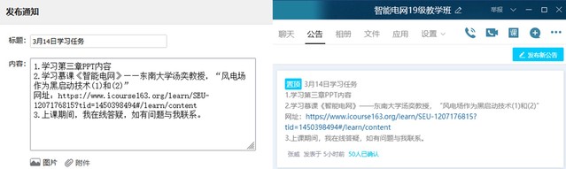张威老师采用慕课+超星学习通+QQ群在线答疑相结合的方式,充分调动学生积极性,了解学生学习情况,及时解决学生学习疑惑。教学实施过程中,课程资源选择了东南大学汤奕教授在慕课所讲授的《智能电网》这一优秀的教学资源;利用学习通便于建立随堂练习、章节习题库和发起话题讨论等优点,建立学习班级;基于学生的网络习惯,建立QQ群进行随堂答疑;最后,基于学习通平台,发布随堂测试,了解学生对知识点的掌握情况。