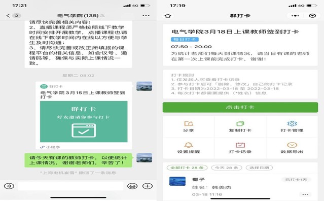 为提醒老师们线上上课时间,掌握教师授课情况,学院除安排督导巡课外,建立每日群打卡功能,统计每天教师到课情况,确保每一位教师都能按时、保质保量完成线上教学工作。