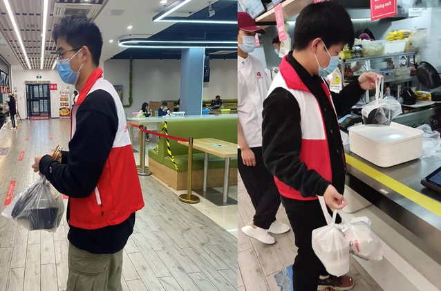 朱鹏飞和张英健在校园准封闭期间,不仅主动帮助同学们打包饭菜,同时提醒“科学佩戴口罩、保持一米就餐安全距离”的有序就餐规则。