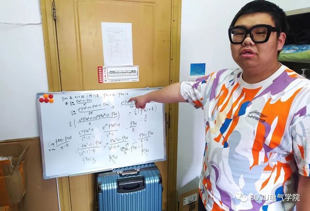 走访中发现,受疫情影响,学校对校园采取闭环管理,开展线上学习,虽然在一定程度上给同学们的学习、生活带来了诸多不便,但同学们的学习热情依旧高涨。每天都能准时登陆网课平台,参与线上教学和互动。25宿的周竞泽同学还自购小黑板架在行李箱上,临时担当起微积分的小老师。为室友演算解题过程,开展高数辅导。(撰稿/摄影:徐雷;审核:卿海龙)