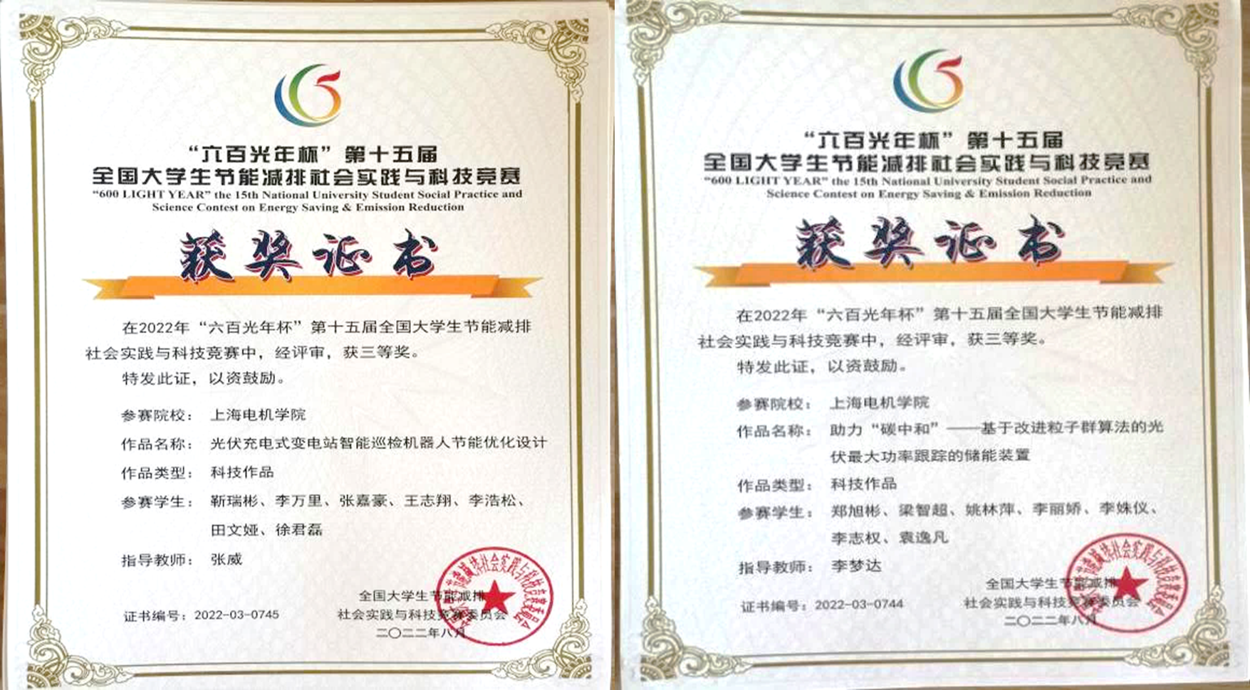 近日,2022年“六百光年杯”第十五届全国大学生节能减排社会实践与科技竞赛结果公布,我校学子完成的两个作品荣获国家三等奖。