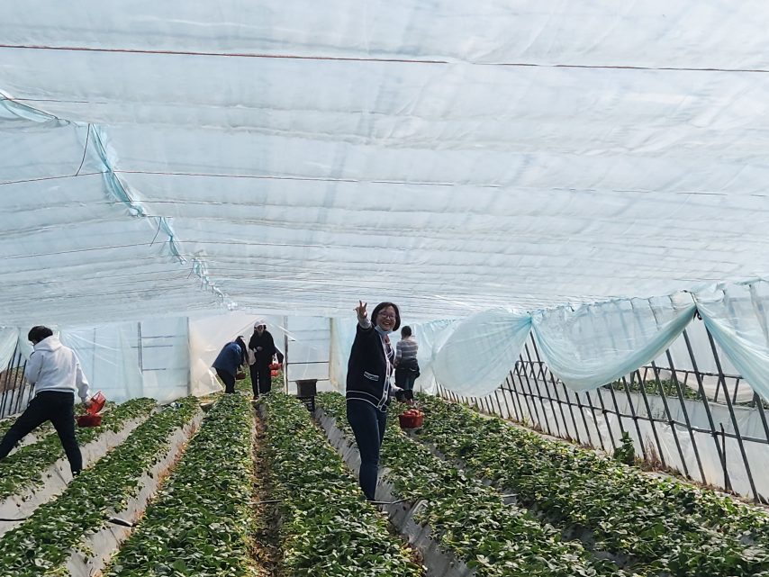在采摘活动中,老师们时而单独行动,时而结伴而行,穿梭在草莓园中,挑选自己心仪的草莓,放入篮中,脸上洋溢着丰收与收获的喜悦之情。