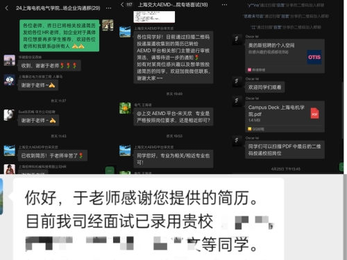 招聘会上,上海交大AEMD平台、奥的斯电梯管理(上海)有限公司、上海华建电力设备股份有限公司、上海同盛电力有限公司、凯思勒传动技术(上海)有限公司、上海太易检测技术有限公司、上海北羽自动化科技有限公司、富奥汽车零部件股份有限公司、特来电新能源股份有限公司、上海贺通人力资源管理(集团)有限公司、上海新华控制技术集团科技有限公司、上海纽特科机械科技有限公司、上海中车艾森迪海洋装备有限公司、上海康达电力安装工程有限公司等通过PPT宣讲、播放宣传片等方式向同学们介绍了企业概念,招聘岗位职责要求、工作地点、薪资及福利待遇等。为便于企业与学生更好地交流,awc777万象城娱乐官网为每家参加宣讲企业专门建立了微信面试群。