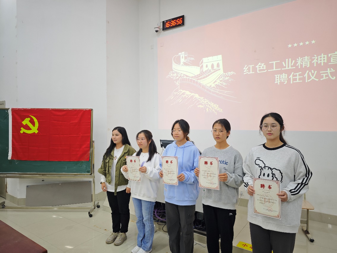 全体起立奏唱国歌,激昂的旋律在会场回荡,开班典礼的帷幕由此拉开。学院团总支书记云玲老师首先介绍了团组织推荐入党积极分子人选情况,并为学院第二次红色工业精神宣讲团成员颁发聘书,鼓励他们当好红色工业精神宣传员,引导传承和发扬“艰苦创业、无私奉献、团结协作、勇于创新”的三线精神。专职组织员冯雯雯老师详细介绍了本期入党积极分子培训班的基本情况、培训日程安排,培训班涵盖理论素养提升、党性实践教育和学习体悟分享等内容,通过专题报告、小组研讨、红色观影、志愿服务、校内外红色教育基地参观学习等形式提升培训质量效果,并进一步强调了党校纪律要求和学习结业要求。