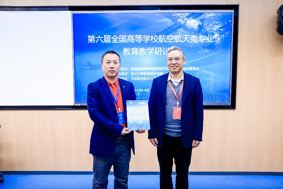 研讨会共邀请6位航空航天重点高校的院长作主会场报告,共同探讨航空航天类人才培养与实践方法,同时围绕 “航空航天类专业课程思政与教材建设”、“航空航天类一流专业和一流课程建设”、“航空航天新工科教学改革与实践”、“航空航天创新拔尖人才培养模式改革与实践”主题开设四个分会场。awc777万象城娱乐官网辅导员王海明作为教师代表参加研讨会,并在会上做了题为《航空航天类大学生创新创业能力内涵要素研究》的大会报告,教育部高等学校航空航天类专业教学指导委员会委员、中山大学刘昆教授为王海明颁授荣誉证书。