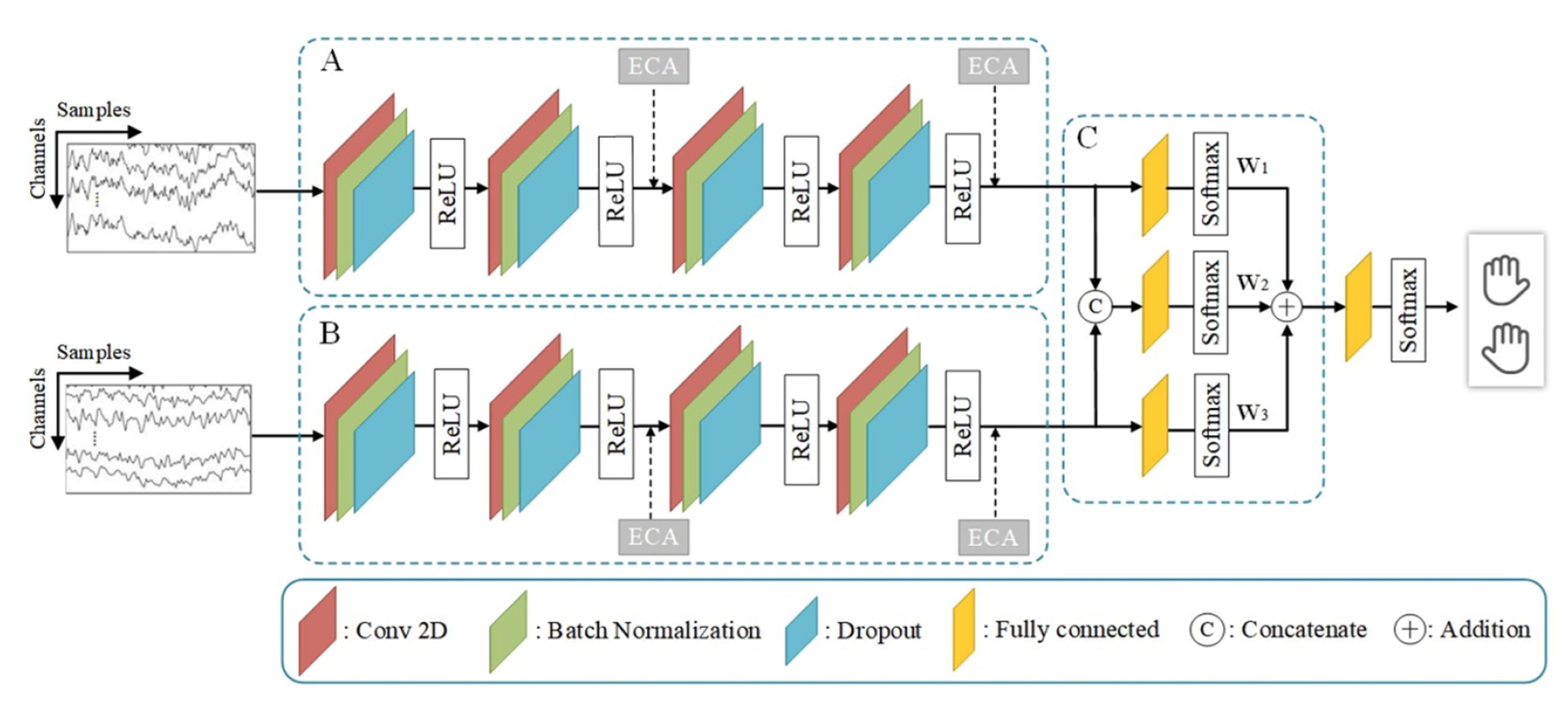 大脑是一个由神经元、局部回路和功能区组成的复杂系统。神经通路连接不同的区域并协作完成复杂的认知和行为功能。EEGNet被认为是一种非常成功的基于卷积网络的融合脑电图(EEG)信号解码模型。但是有两点可以改进:首先,激活的大脑区域可能因不同的BCI任务而异;其次,高密度脑电图信号有可能提供更丰富的大脑信息。然而目前的大多数研究只是将来自不同通道的EEG信号叠加在一起,忽略了脑模型上EEG电极的空间关系以及不同脑功能区域之间的功能连接。
