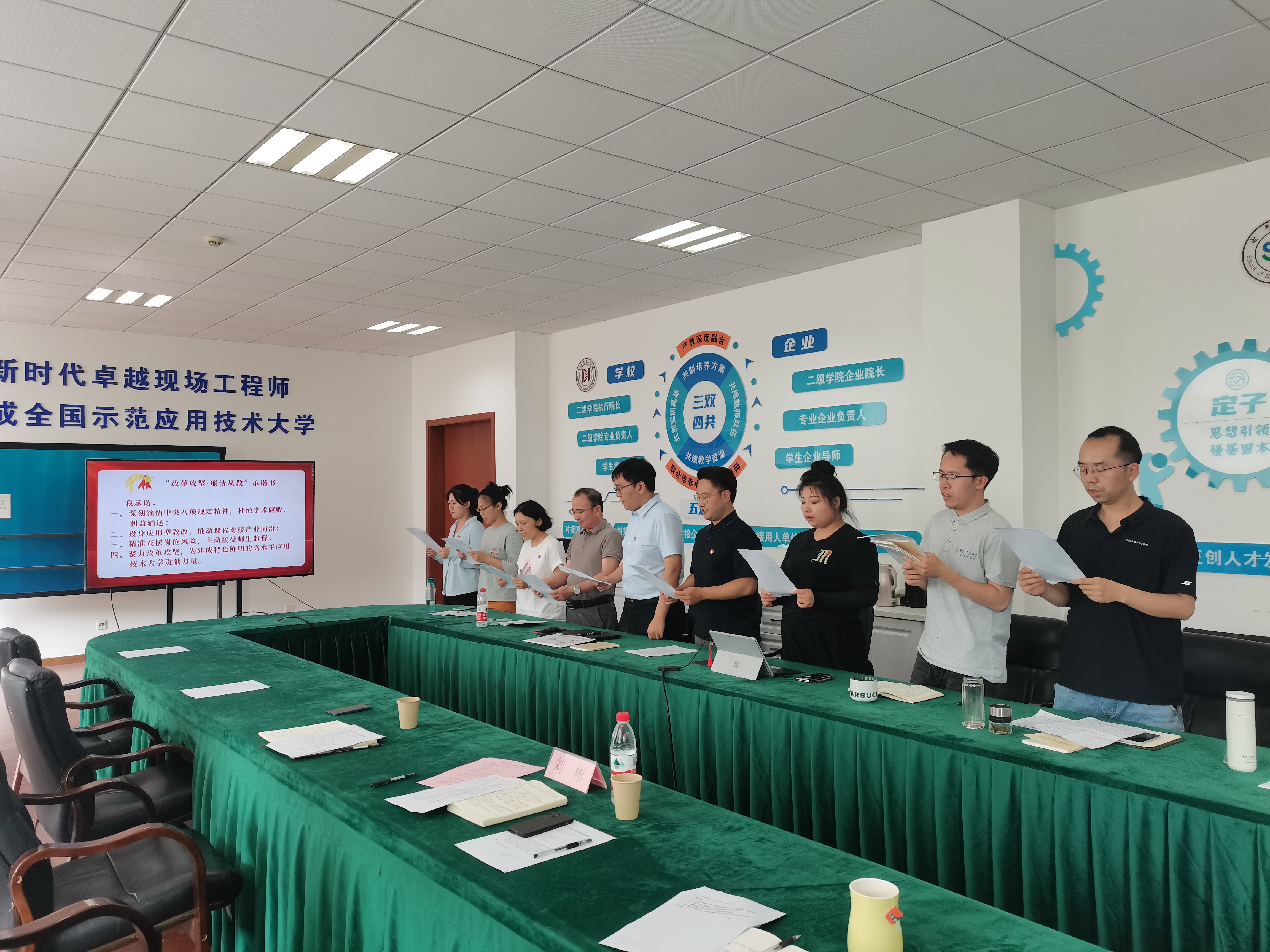 在交流研讨学环节,与会党员踊跃发言,交流学习感悟,大家结合学习教育的心得体会,聚焦改革中的困惑问题、教师参与改革的积极性、产教融合在基层的落细落实、教师当下状态、需求以及师生共成长的情怀等问题深入开展交流讨论。党员教师纷纷表示要将作风建设与改革发展密切结合,在融会贯通中确保学习教育成果在“两个试点改革”中落地见效,支部党员蒋璐峥带领大家在铿锵有力的宣读中作出“改革攻坚·廉洁从教”的庄严承诺。