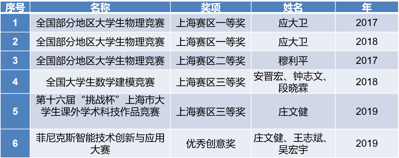 学生参加各类学科竞赛,产生了一批优秀成果。如2018年“全国部分地区大学生物理竞赛”一等奖,2018年“全国大学生数学建模竞赛”三等奖,2019年“菲尼克斯智能技术创新与应用大赛”优秀创意奖等。