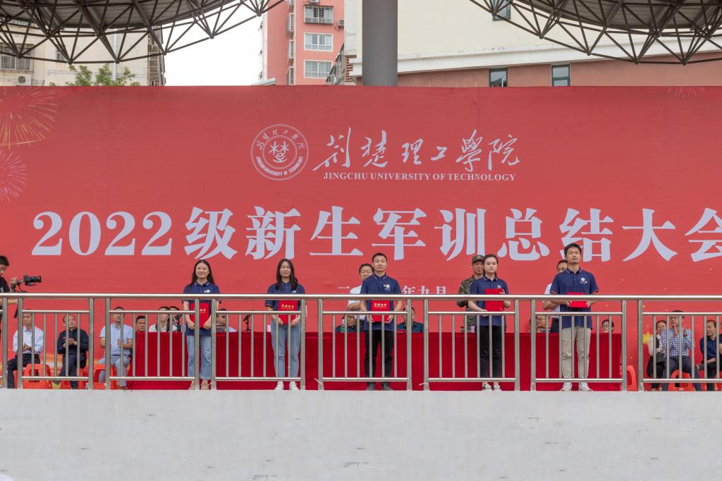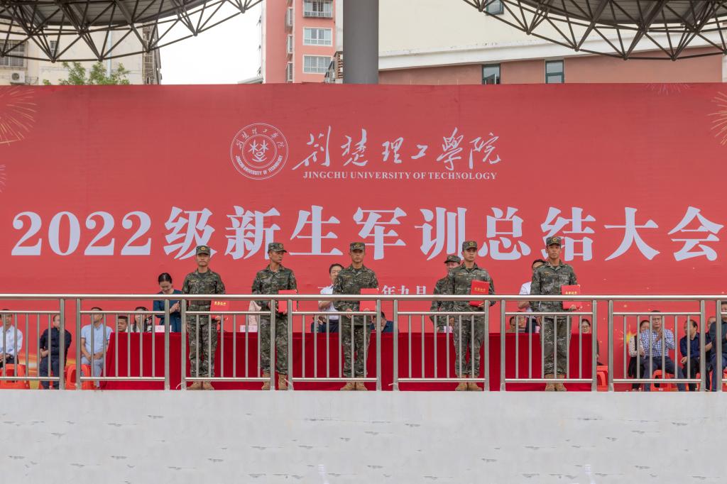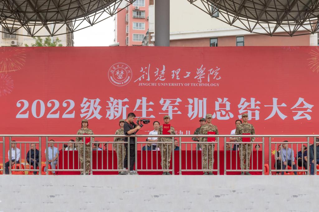 曹甜东宣读《关于表彰2022级学生军训先进集体和先进个人的决定》。主席台领导分别为19个优秀连队、16名优秀指导员、45名优秀教官、472名优秀学员代表授旗、颁奖。