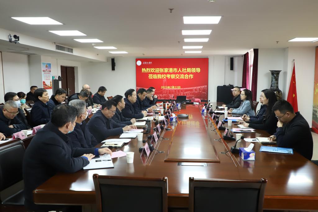 2月22日下午,张家港市人力资源和社会保障局党委书记、局长张毅一行来校就进一步加强校地合作进行对接和交流。beat365党委书记王学民出席会议并致欢迎辞,党委常委、副校长戴伟主持会议。