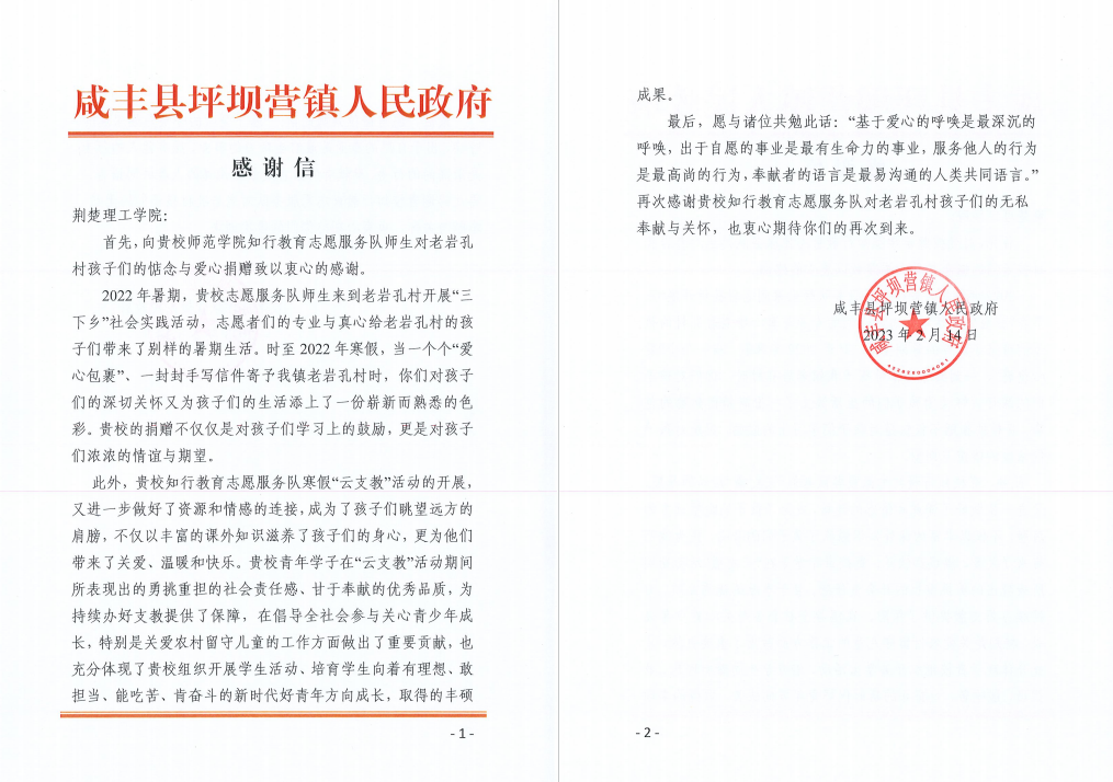 近日,beat365收到来自咸丰县坪坝营镇人民政府的一封感谢信,信中对beat365的志愿服务表示衷心的感谢,对beat365知行教育志愿服务队寒假“云支教”的志愿者们的突出表现给予了高度评价。