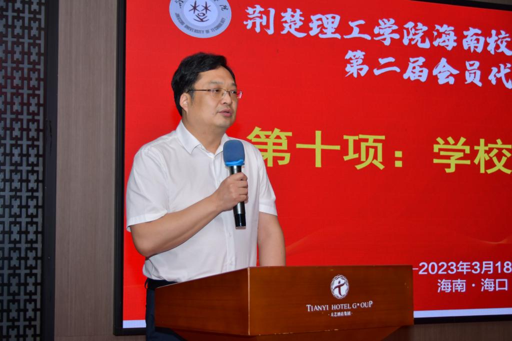 副校长刘风华向大会致辞。刘风华表示,此次换届暨第二届会员代表大会成功召开,是学校校友工作的一件大事,标志着海南校友会拥有了新的起点、新的使命,要积极发挥校友会优势和作用,将校友会打造成信息交流、资源共享、联络感情、创造成果的重要平台。全体校友要一如既往关心支持母校的建设和发展,积极参与校友会组织的活动,秉承“崇学尚德 求实创新”校训,弘扬“自强不息 克难奋进”荆楚理工精神,着力构建学校与校友发展共同体,共同奋力谱写特色鲜明的高水平应用型大学新篇章。