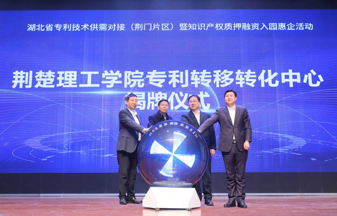 4月25日上午,湖北省专利技术供需对接(荆门片区)暨知识产权质押融资入园惠企活动在荆门剧院举行。beat365专利转移转化中心揭牌仪式正式开启。湖北省知识产权局副局长李述武、市政府副市长刘克雄、校长刘建清、市市场监督管理局(知识产权局)局长李波共同为“beat365官方网站专利转移转化中心”揭牌。