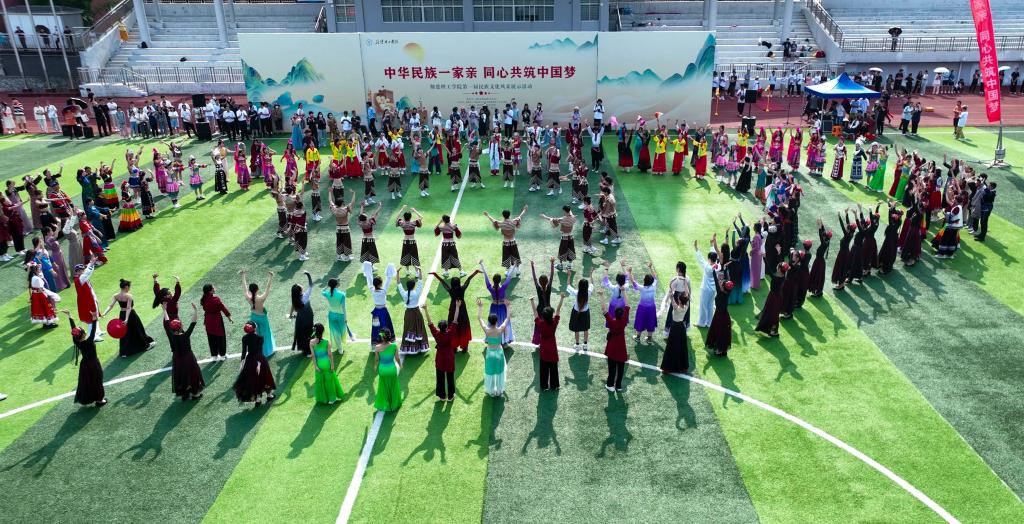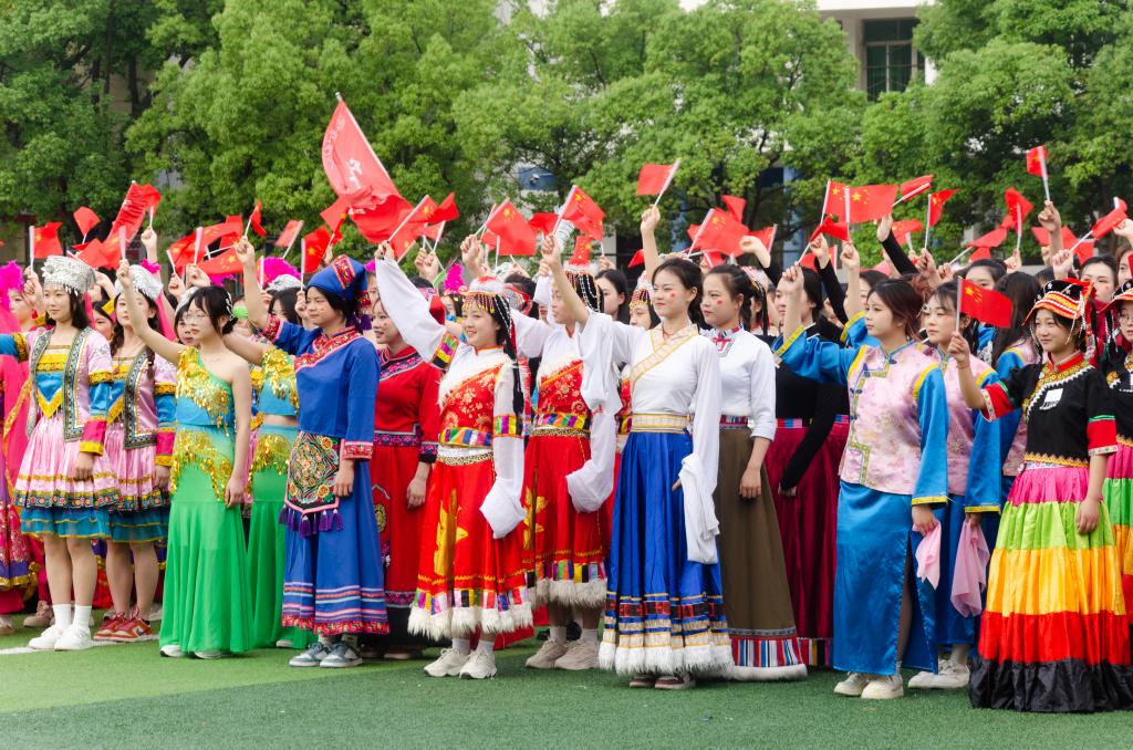 在一曲欢快的摆手歌中,各民族师生跳起了民族团结的舞蹈,现场的同学们也都纷纷加入,呈现了一部各民族交融汇聚成多元一体的史诗,增强了各民族师生对中华文化的认同感和自豪感。