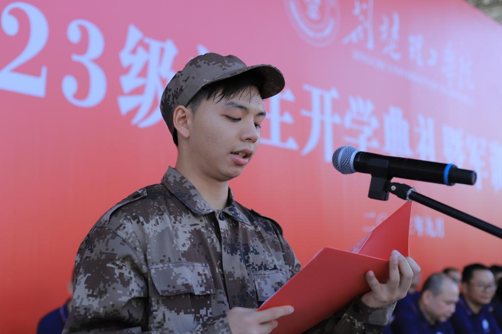 新生代表李哲轩号召同学们以饱满的热情迎接为期两周的军训生活,在军训中磨练意志,养成能吃苦,不怕苦,不怕累的优良品质。在未来大学四年里,能够不惧风浪,不畏艰难,树立高远的目标,争做有为青年。