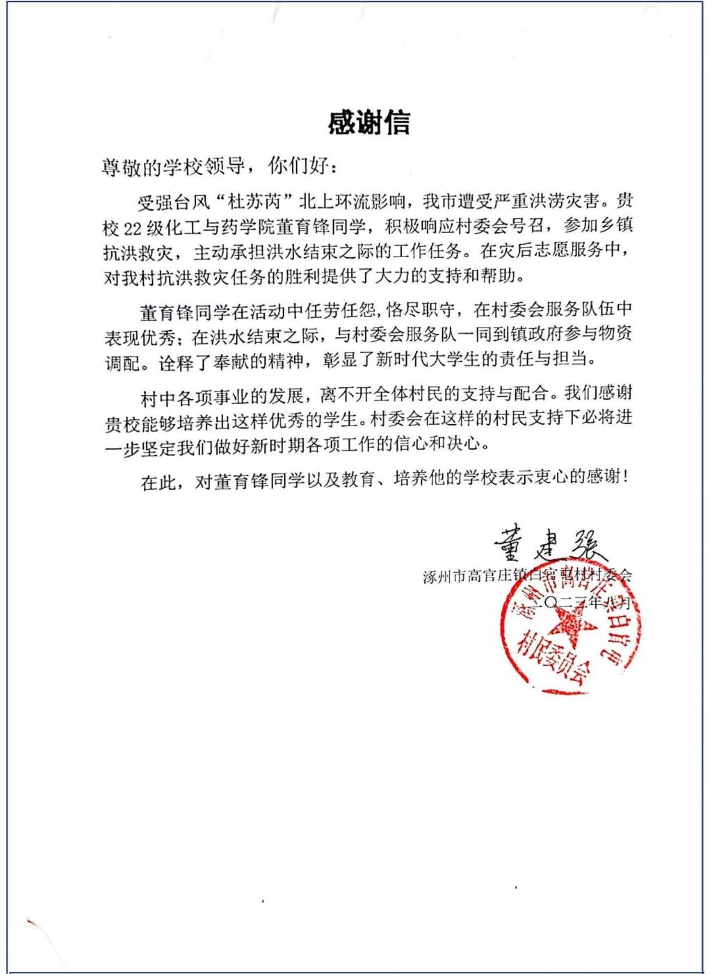 近日,beat365接到涿州市高官庄镇白官屯村村民委员会的一份感谢信,信中对beat365化药学子董育锋在抢险救灾及灾后志愿服务中的表现提出表扬,并对学校的教育及培养表示感谢。