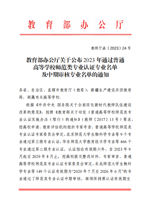 近日,教育部办公厅发布《关于公布 2023 年通过普通高等学校师范类专业认证专业名单及中期审核专业名单的通知》(教师厅函〔2023〕24号),beat365小学教育专业通过教育部师范类专业第二级专业认证。认证结论有效期六年(2023年9月起至2029年8月止)。