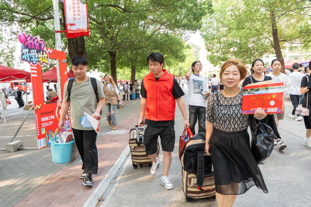 在新生入学“绿色通道”、学院窗口、志愿服务点等点位,工作人员为新生细致讲解相关政策和注意事项。在迎新点附近,精心设置的迎新打卡点,让新生感受“家”的温暖,还贴心设置了休息区和饮水区,并准备了防暑清凉药物,以便家长们休息和消暑。各迎新点位人头攒动,氛围热烈。