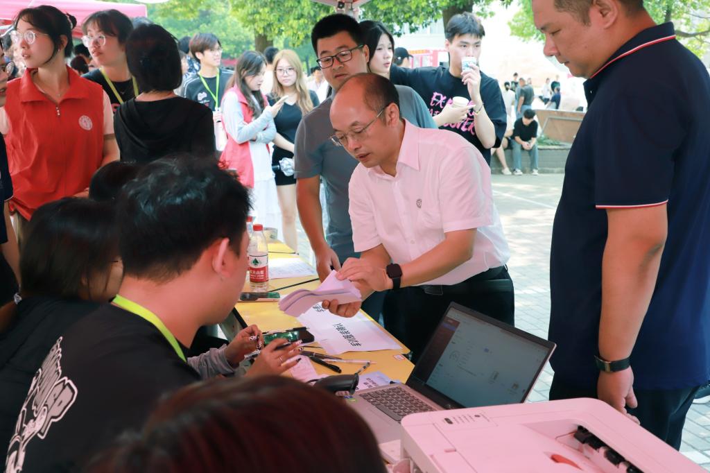 在迎新现场,党委书记王学民、校长张友兵等一行与2024级新生和家长们亲切交谈,来到各报到点详细了解新生报到、入学安排、学生入住等工作情况,慰问现场忙碌的师生和志愿者们,并为2024级新生们发放生日礼包和爱心礼包,勉励新生们要尽快适应大学生活,积极面对挑战,在大学的舞台上尽情展示自己的才华,勇于攀登知识的高峰,实现自己的梦想。