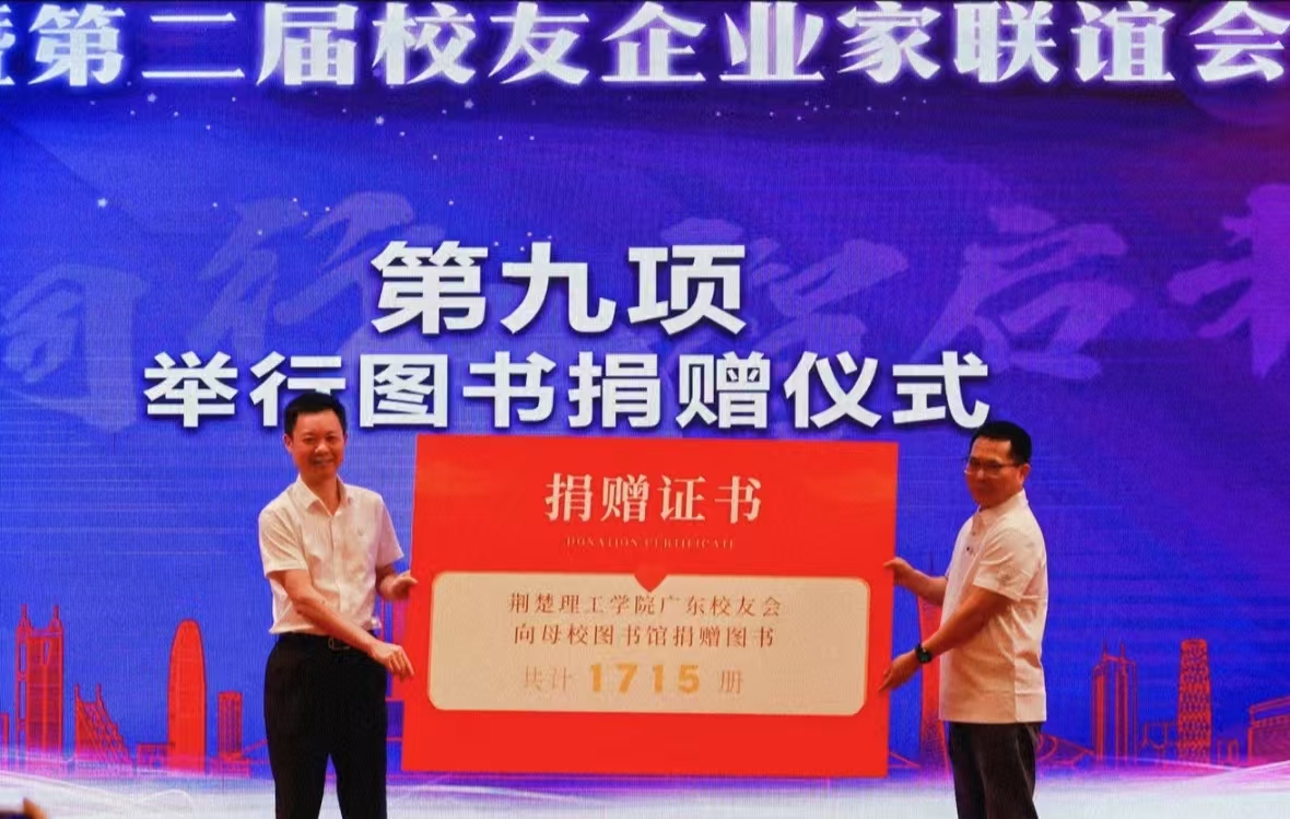 刘亚苗详细介绍了荆门市的投资环境、产业政策以及发展机遇,诚邀校友企业家们回乡投资兴业,为家乡的经济发展贡献力量。会上,还举行了图书捐赠和基地授牌仪式,广东校友会向母校捐赠价值码洋10万元,1715册图书,广东劳斯化工有限公司等12家校友企业与学校达成协议,共同建立教育实践基地及毕业生就业基地。