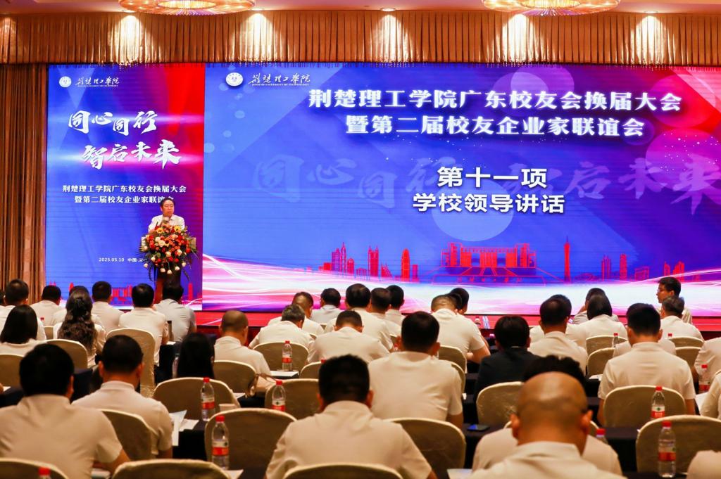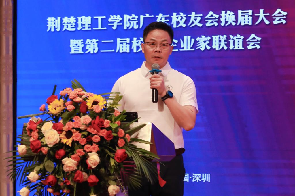 王学民向大会致辞。他表示校友是母校最闪亮的名片,是母校最宝贵的财富,更是母校事业发展最可信赖的力量。校友会是大家共同的精神家园,是汇聚智慧、促进成长的能力磁场。希望新一届校友会领导班子进一步凝聚校友力量,以“深圳速度”重构校友生态,搭建起更为广阔、高效的交流平台,让每位奋斗者在南粤热土都能找到归属感。并寄语校友企业家代表, 向“新”而行、向“高”攀登,勇立潮头,为区域经济社会发展贡献荆楚理工校友力量。期待各位校友企业家,通过产学研合作、设立奖助学金、提供实习就业岗位等多种方式,为学校的人才培养、科学研究和社会服务注入新的活力,推动学校与校友企业共同发展,形成良性互动的良好局面。