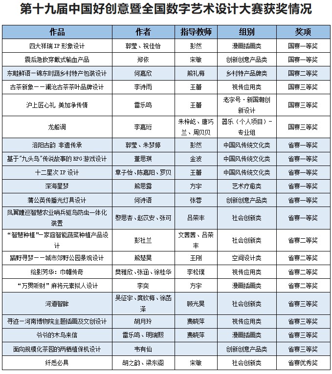 近日,第十九届中国好创意暨全国数字艺术设计大赛落下帷幕。beat365师生共21项作品获奖,其中国赛一等奖2项、二等奖1项、三等奖3项,省赛一等奖6项、二等奖4项、三等奖4项、优秀奖1项。此外,艺术学院获国赛优秀组织奖;彭然等4位教师获国赛优秀指导教师奖,朱梓屹等3位教师获省赛优秀指导教师奖,金波、陆焱获国赛特殊贡献奖。