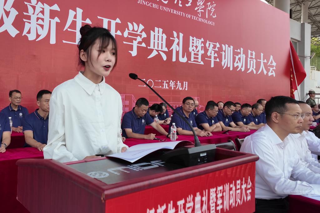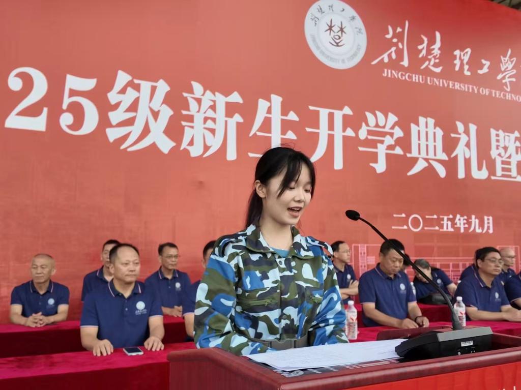 新生代表吴昶豫呼吁全体新生,要珍惜大学时光,既要在“读万卷书”中拓宽知识视野,也要在“行万里路”中锤炼过硬本领,以好奇为舟,以勤奋为桨,在荆楚理工的沃土上,探索知识的星辰大海,奔赴属于我们的未来。