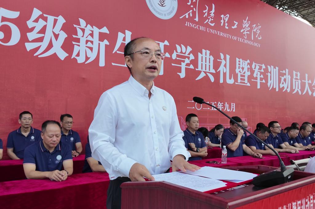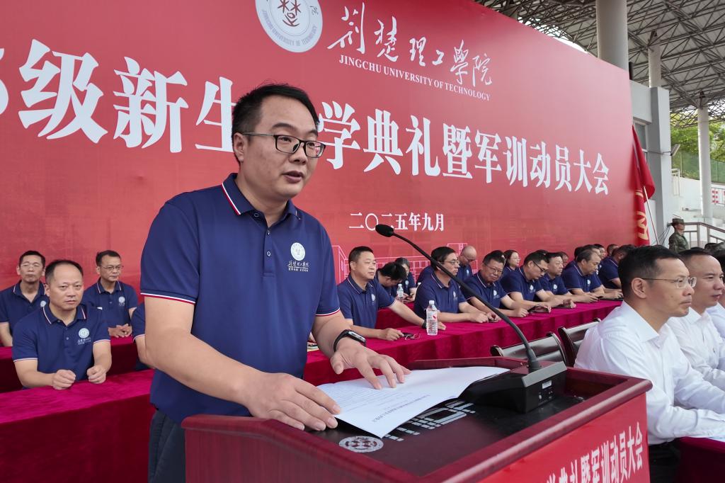 张友兵代表全体师生员工向2025级新生表示欢迎,发表题为“逐梦青春荆楚 奋进强国新篇”的讲话,对新生提出四点殷切期望:一要胸怀家国,立青春之志,将个人理想融入民族复兴伟业,以“强国有我”的担当锚定人生方向;二要勤学深悟,炼卓越之能,沉下心钻研专业知识,在求知探索中筑牢成长根基;三要敢破敢立,铸创新之魂,打破思维定式,在实践中激发创新潜能;四要明德修身,固立身之本,涵养高尚品格,用青春之笔书写无愧于时代的辉煌篇章。