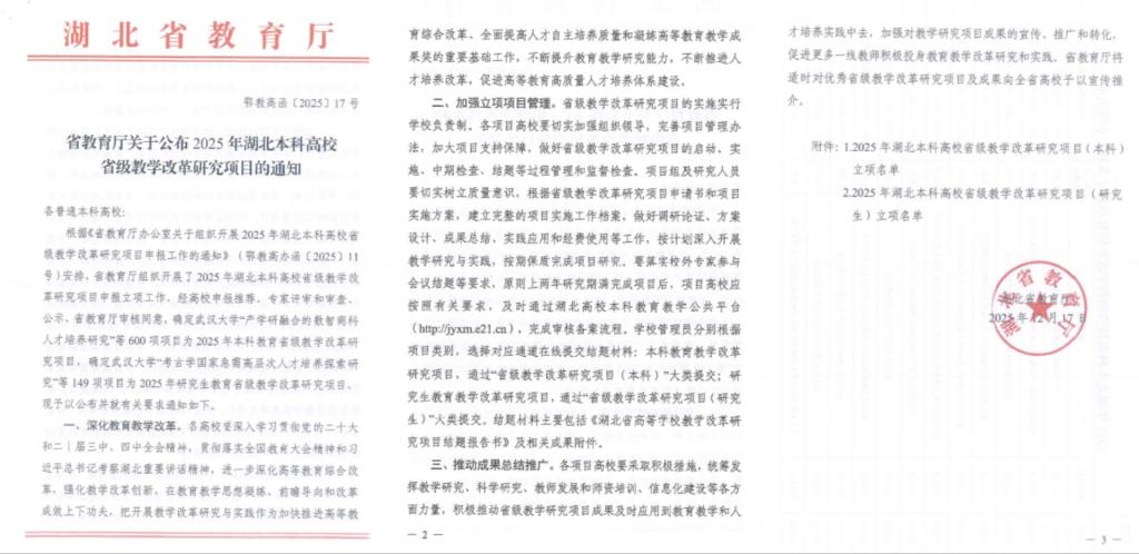 近日,湖北省教育厅发布了《省教育厅关于公布2025年湖北本科高校省级教学改革研究项目的通知》(鄂教高函〔2025〕17号),beat365获批7项省级教学改革研究项目,其中2项委托项目。