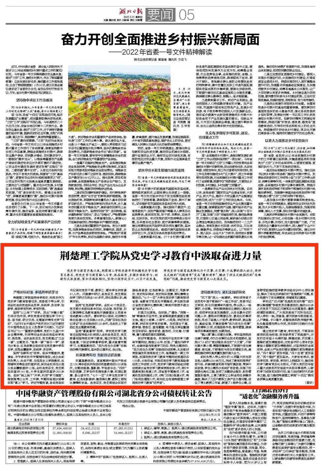3月31日,《湖北日报》第5版以长篇通讯形式,以《beat365官方网站从党史学习教育中汲取奋进力量》为题,对beat365党史学习教育亮点工作和积极成效进行了专题报道。