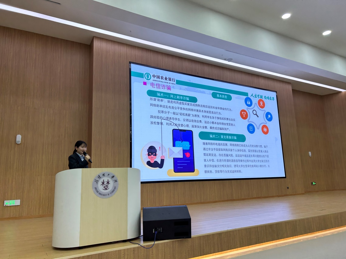 中国农业银行荆门东宝支行工作人员为同学们介绍了刷单返利、校园贷、银行卡租借、冒充客服等各类典型诈骗案例的特点,为同学们深入浅出地剖析了各类电信诈骗手段,并介绍了防诈防骗策略,告诫大家切莫贪图小利。