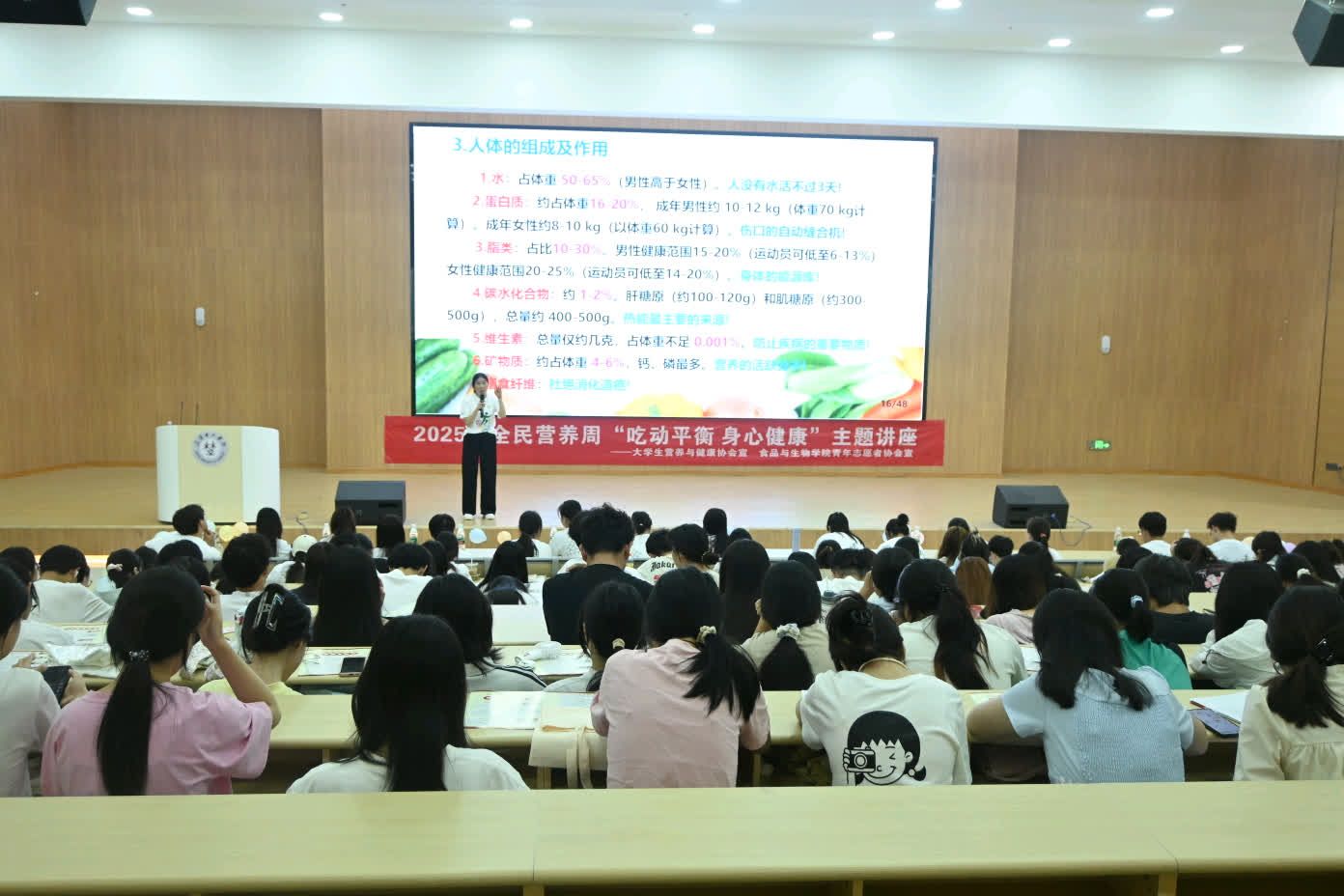 讲座环节邀请食品与生物学院教授、国家一级公共营养师简清梅担任主讲嘉宾。她以“健康管理”为核心,结合《中国居民膳食指南(2022)》,系统阐释了国家提出“健康管理三年行动”的重要性和必要性。在快节奏的现代生活与繁重的学业压力下,当代大学生普遍面临“饮食结构失衡”的问题。针对这一现状,简清梅教授探讨了“怎么吃更健康”,并将“理想膳食模式”与“校园常见饮食现状”进行鲜明对比,强调“均衡营养摄入与规律运动”是健康管理的基石。在互动环节,师生们围绕“熬夜后如何补充营养”“减肥期间的饮食安排”等问题进行交流,现场互动频繁。