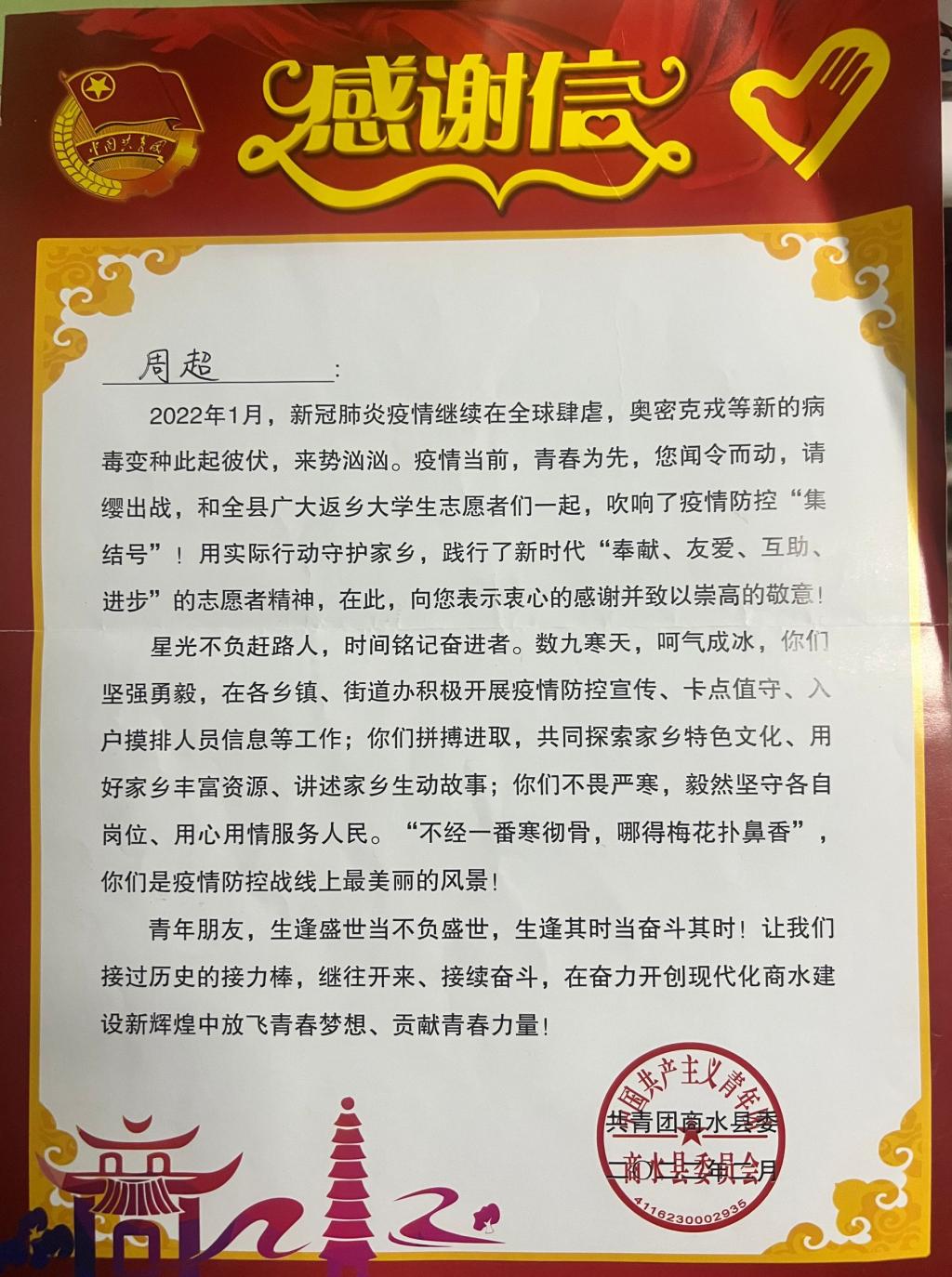 20221月,河南省疫情防控管理升级。面对家乡抗疫压力大、任务重、人手紧张的局面,耿慧杰和周超主动请缨,为家乡抗疫工作提供志愿服务、贡献青春力量。数九寒天,呵气成冰,耿慧杰、周超不畏严寒、不惧艰辛,在乡镇和街道积极开展防疫宣传、卡点值守、入户排查、运送物资、核酸检测等工作。他们忠于职守,不分昼夜,积极奋战在疫情防控一线,以实际行动践行“奉献、友爱、互助、进步”志愿精神,受到当地群众高度赞誉,赢得政府高度认可。